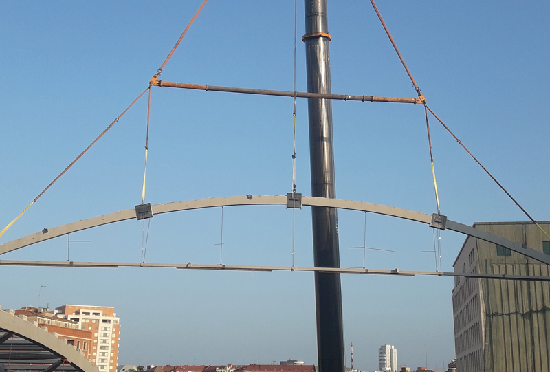 La solución propuesta y ejecutada por RETOVAL fue la rigidización de los nudos articulados del arco, con elementos metálicos que además sirvieran como punto de anclaje del estrobado de la ÚNICA grúa necesaria para el desmontaje de las estructuras.