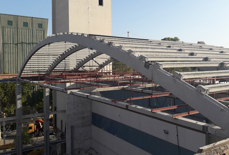El trabajo realizado en esta obra consistió en el desmontaje de 4 de las estructuras de hormigón de la cubierta del vaso de la piscina. Las estructuras eran arcos de hormigón triarticulados.
